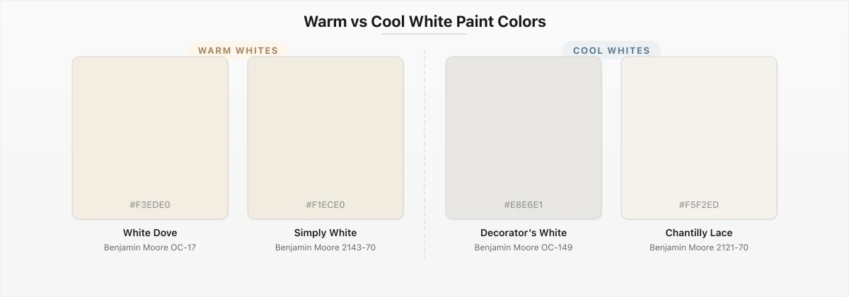 Pink undertones are common in warm whites. Colors like Benjamin Moore's Swiss Coffee carry a faint rosy warmth that feels soft and traditional. Yellow undertones are the hallmark of creamy whites — think of White Dove, which has a buttery quality that pairs beautifully with wood tones and earth-toned furnishings. Blue undertones appear in cool whites and make a space feel modern and clinical. Simply White(Benjamin Moore) is a popular choice that sits close to true white with just the faintest warm cast — it works in nearly any room because its undertone is so restrained. On the cooler side, Decorator's White(Benjamin Moore) carries a subtle blue-gray undertone that reads as bright and contemporary.